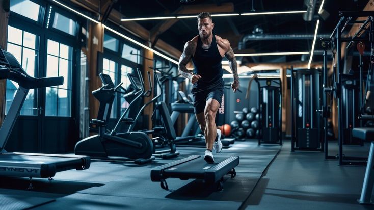 Tattooed man running on treadmill, displaying power and focus in a high-intensity gym setting